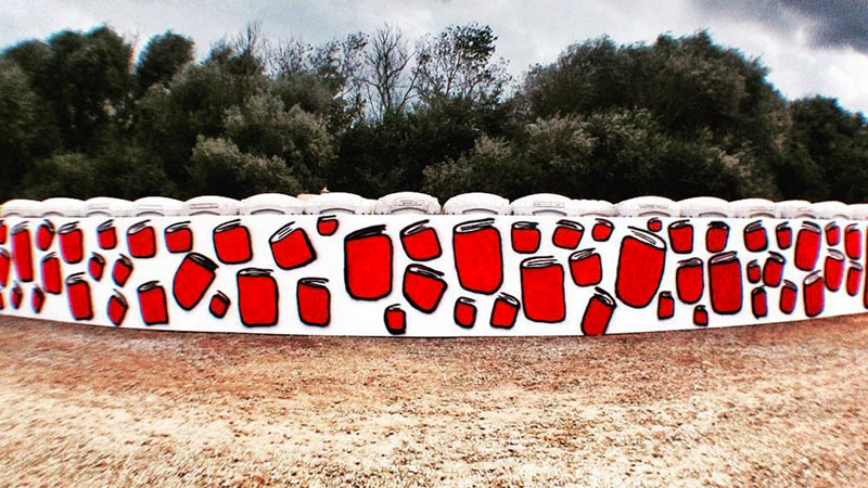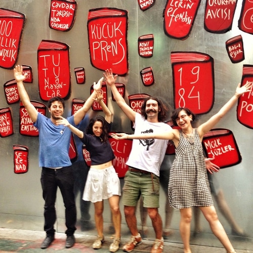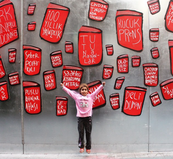 Asked communities at street events: "Your 3 most loved books?" Hand-cut cardboard books, painted red, labeled with Posca pen.